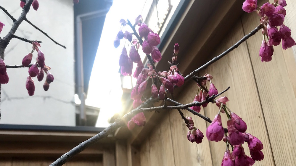 初めて事務所を訪れた際に、散り際を迎えていた白梅にかわり、今日は寒緋桜が花を開いていました。
