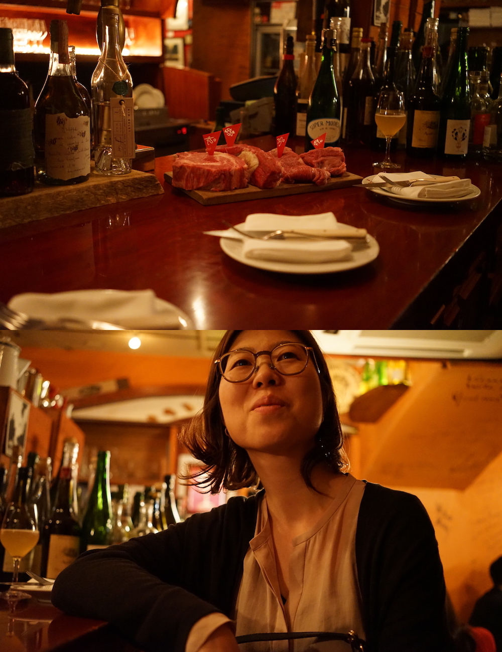 この人との食事はいつも急遽決まる。グッドデザイン賞の展示の設営の後に、パナソニックのデザイナーの友人と一緒に3人で食事。急遽予約できたお店で、熟成肉のステーキをがっつりいただく。