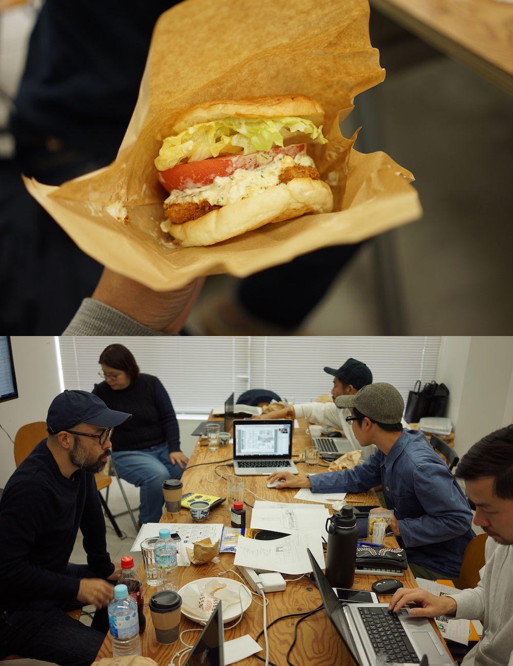 打ち合わせをしながら近所のお店のフィッシュバーガーを食べる。地域の食材を扱う食の新しいプロジェクト。来年春頃には尾道でスタートだ(時間がない)。