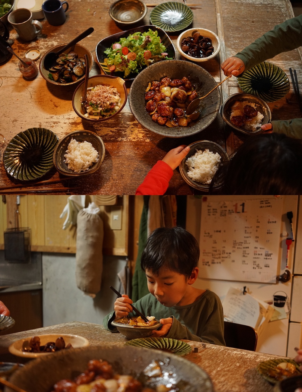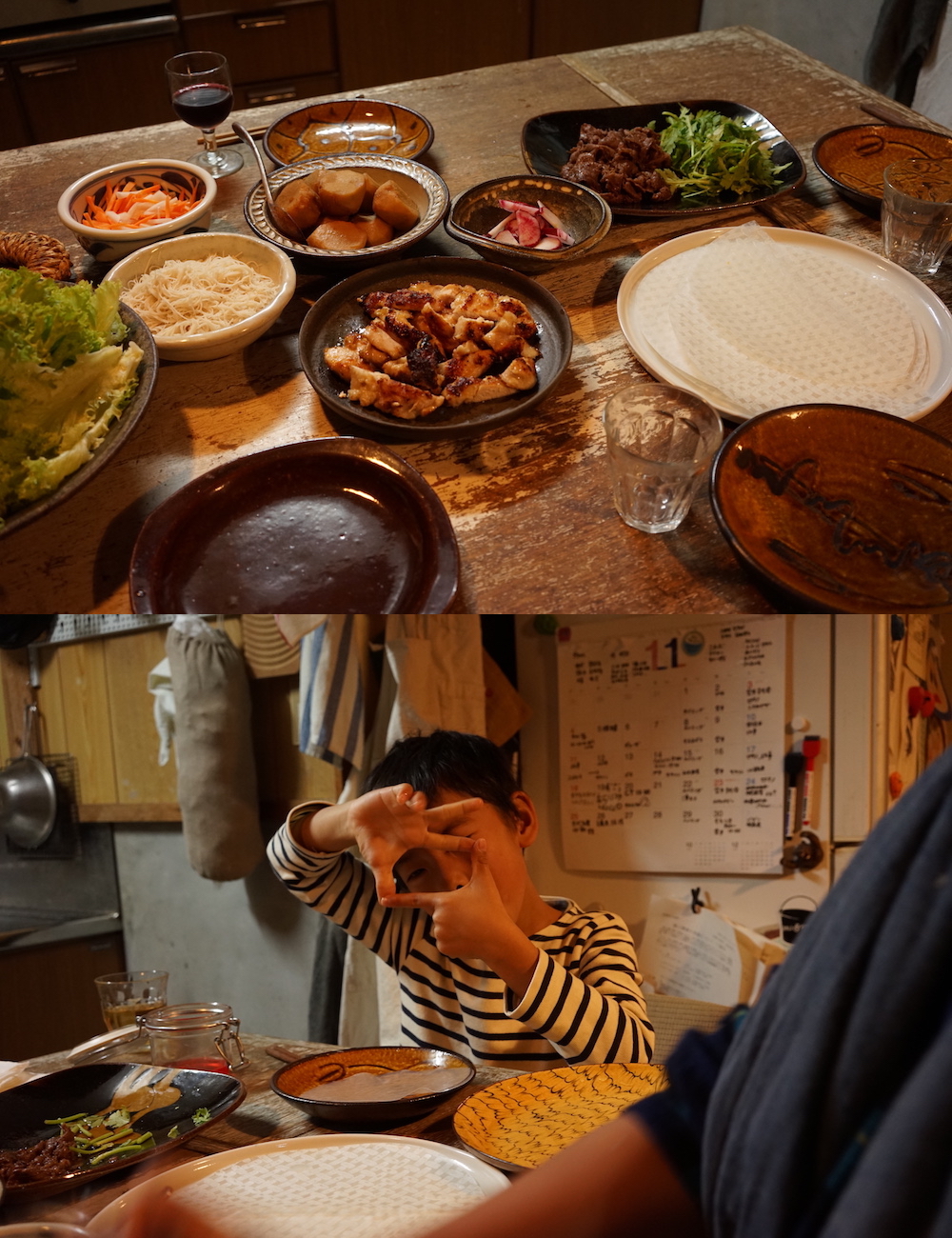 生春手巻きは、高知の陶芸家 小野哲平さんの自宅でごちそうになってからのわが家の定番。ライスペーパーは常備している。野菜もたくさん食べられるし、料理する時間があまりない時にも重宝する様子。ライスヌードル(ビーフン)を入れるのがおすすめ。息子は「カシャ!」と言いながら写真を撮っている。
