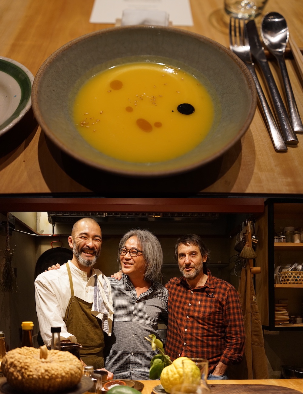尊敬する恩師(中央)と、尊敬するシェフ(右)の料理を、尊敬する料理人(左)に提供してもらって食べる。2011年からの付き合いで、働き方や暮らし方も、みんな大きく変わった。でも、夜な夜な語り合う内容は、かわらず熱くて濃い。