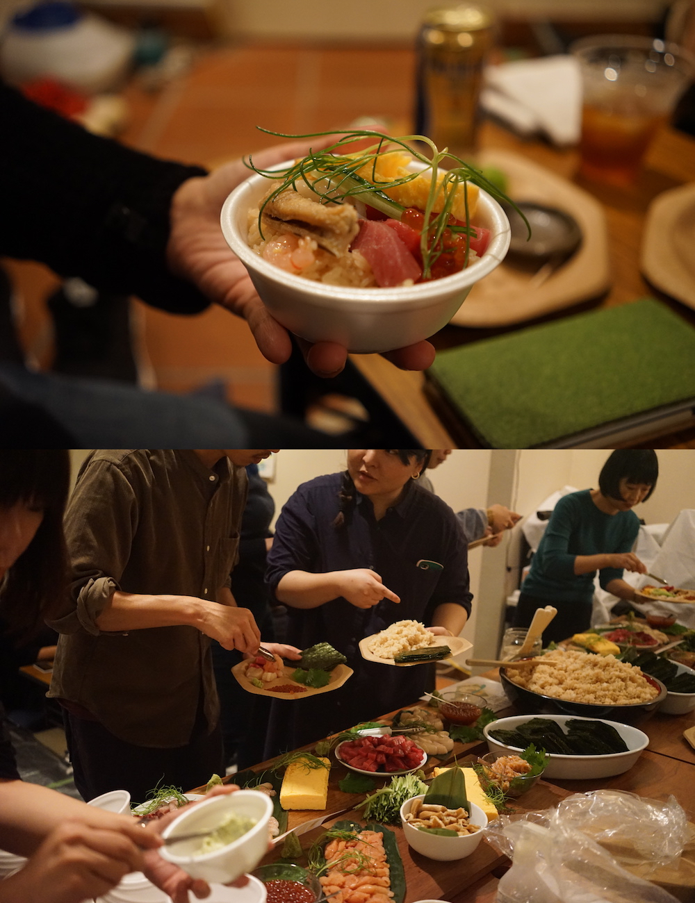 東京で勤めている会社の周年パーティ。ここでもやはり自分たちで好きに食べるスタイル。手巻きでもいいし、海鮮丼でもいい。働き方とか、やりがいの見つけ方も、組織にいながらもある程度の自由があるといいなと思う。