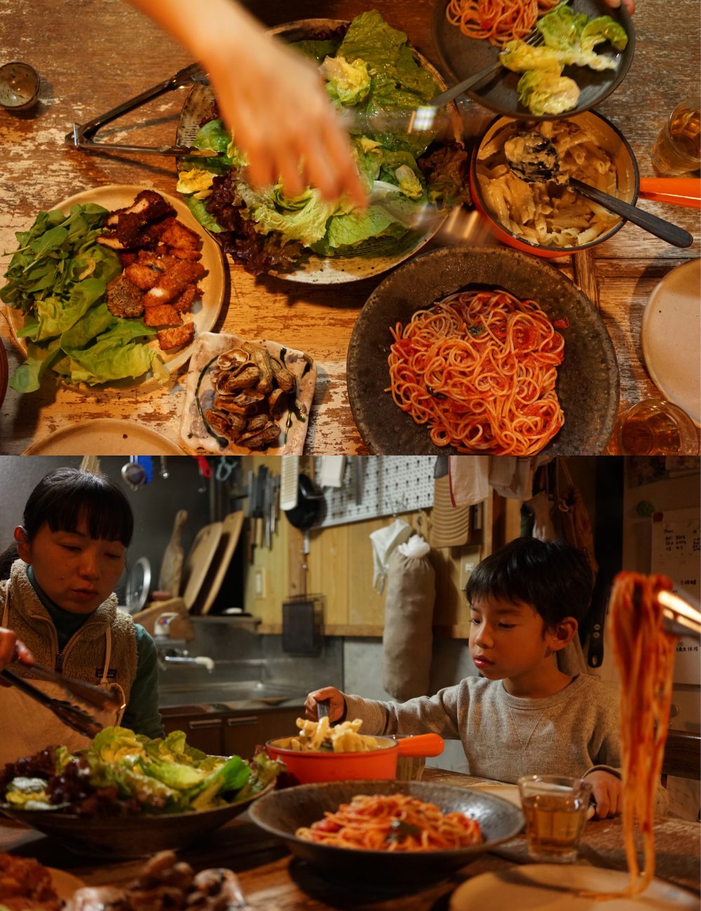 パスタが食べたいとの子どもたち。炭水化物祭り。 自分たちの会社で育てているレタスがものすごく美味しい季節だ。