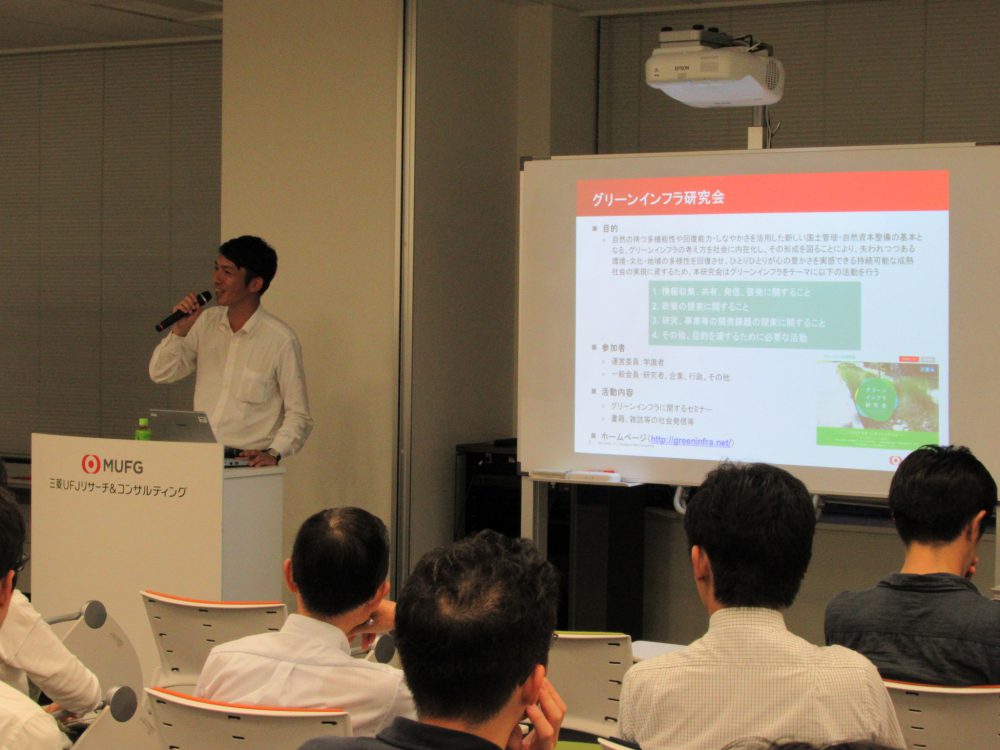 今回は、日本でのグリーンインフラの普及および具体化に向けて研究者や実務者など、多様な関係者の連携の下、活動する三菱UFJリサーチ&コンサルティングの副主任研究員の西田貴明さんにお話を伺いました。