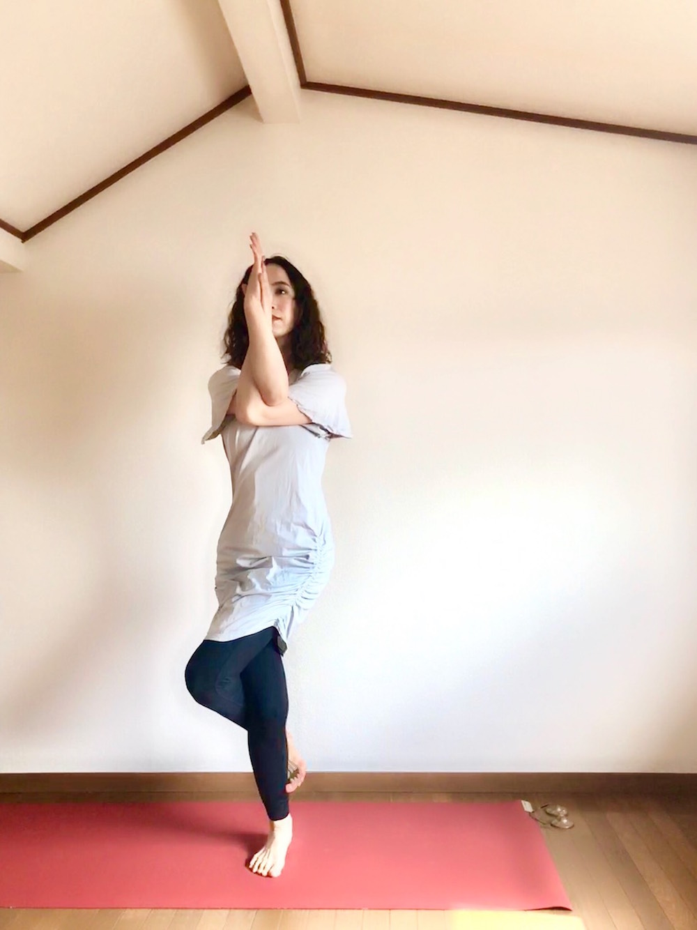 慌ただしく移動した心を鎮めるように木のポーズでバランスを取ってレッスンに備えます。
