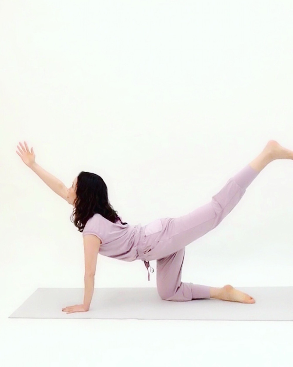 このあとに肘と膝を曲げる動きをセットで行って、たっぷりと動くヨガの前にピッタリです。