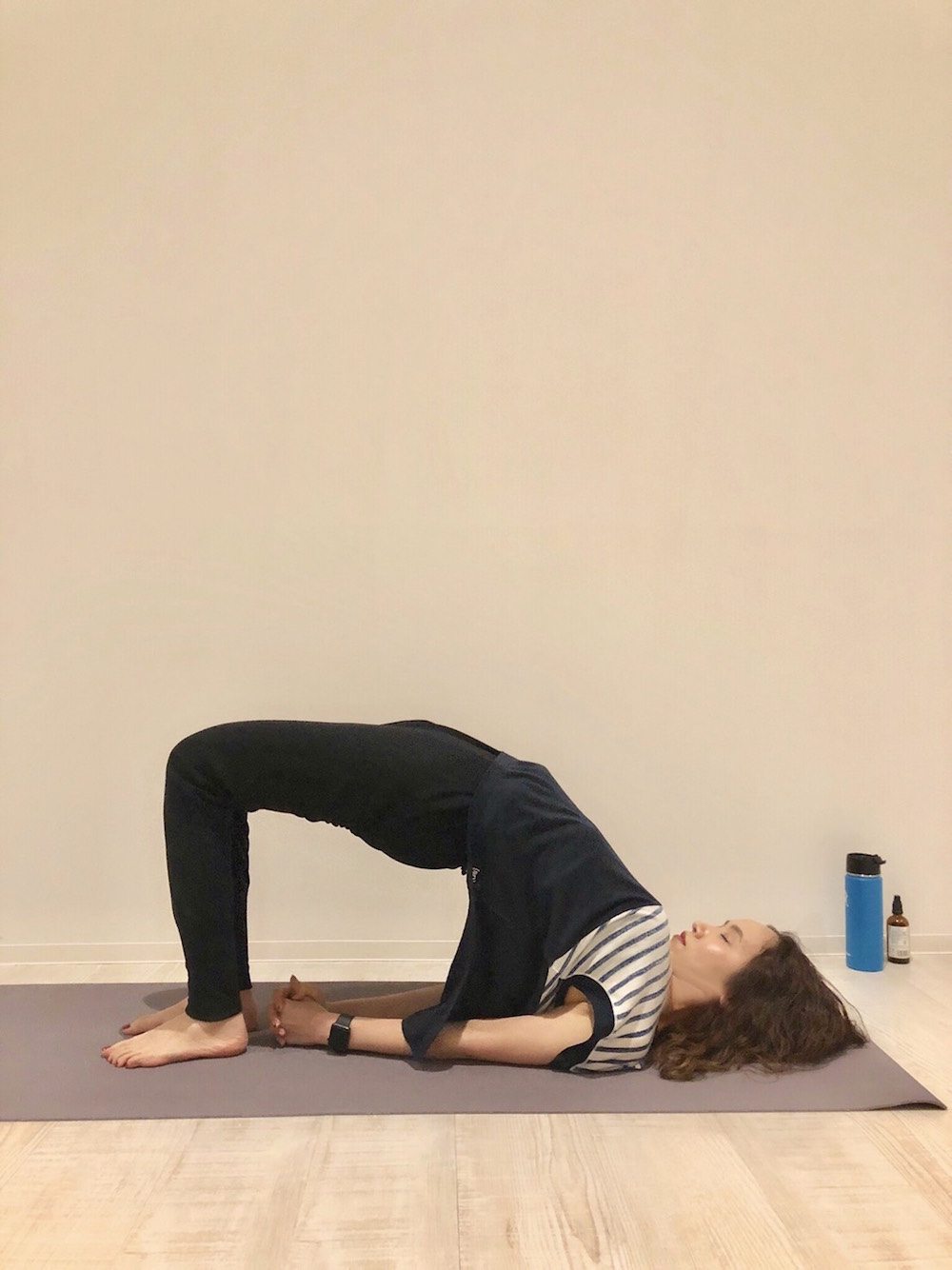 たくさん動いたあとの仕上げにセツバンダアーサナを行なって、数呼吸キープして呼吸を深めながらポーズもそれに呼応するように深まっていくのを味わいます。