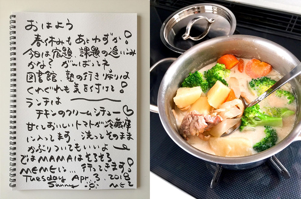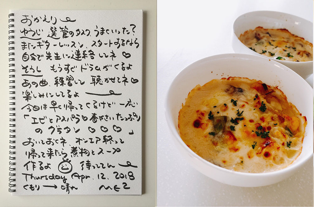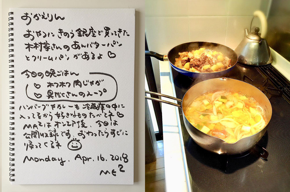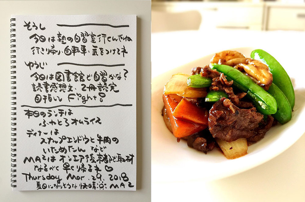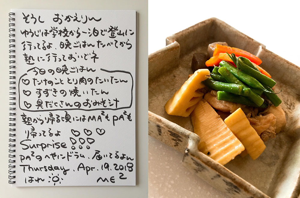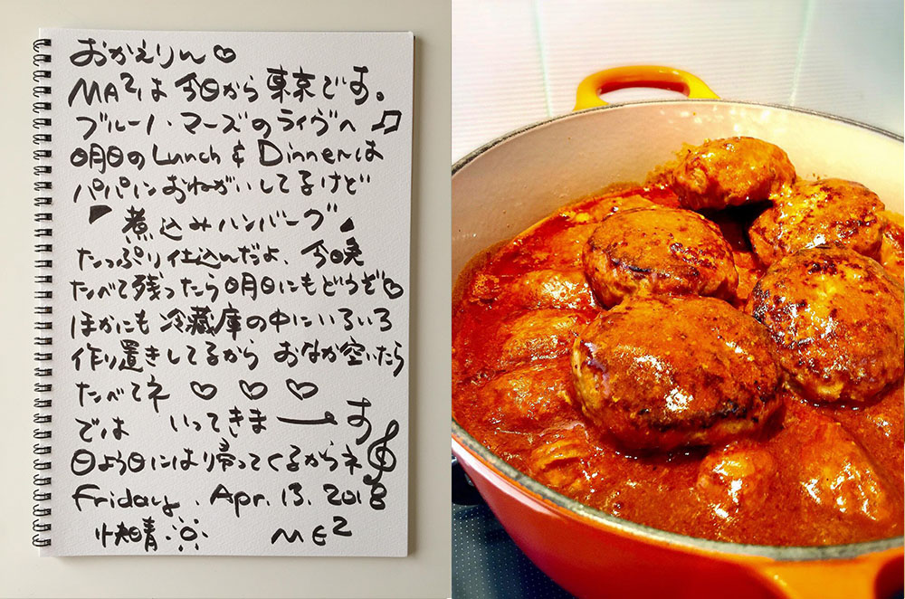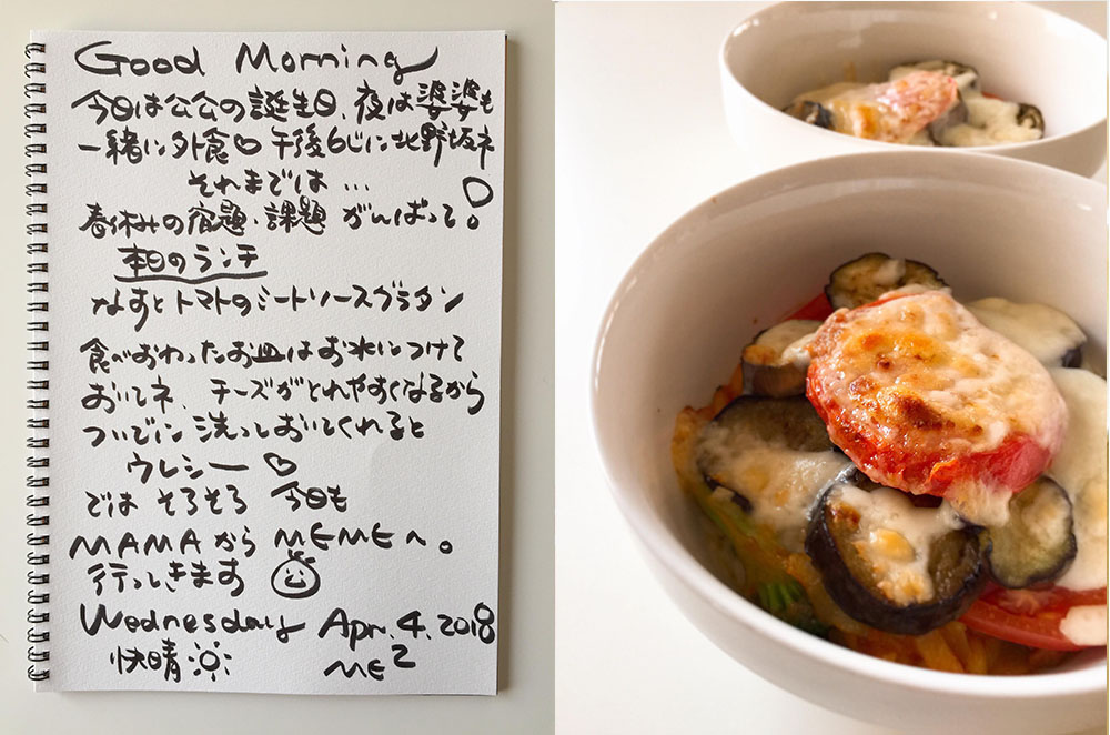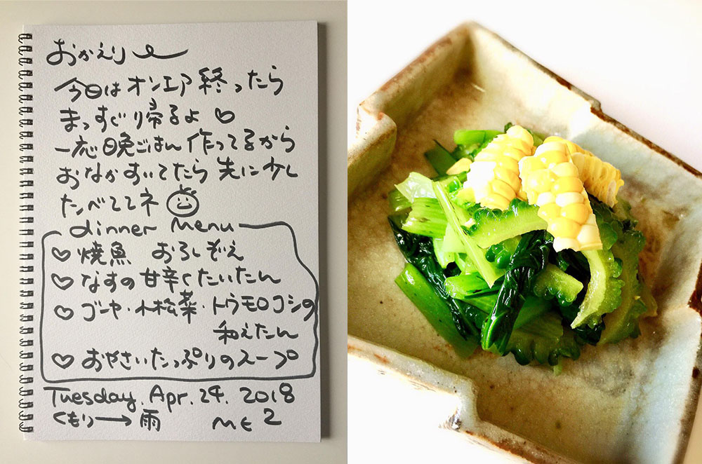 各ジャンルで、独特の視点とセンスで活躍する方々。そんな彼らに、あるテーマで1ヶ月間毎日記録をつけていただきます。日々の習慣や気づきから見えてくる、未来の暮らしのヒント。5月にご登場いただくのは、ラジオパーソナリティのMEMEさん。忙しい日々の中、毎日の献立を筆ペンで書いた置き手紙でお子さんたちとコミュニケーションを取っているMEMEさんに、その日の手紙とお料理を記録、紹介していただきました。