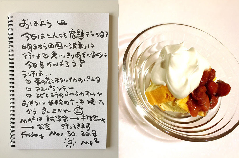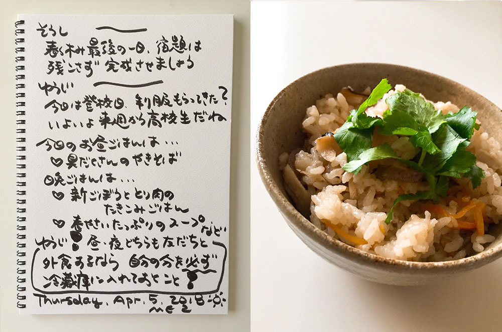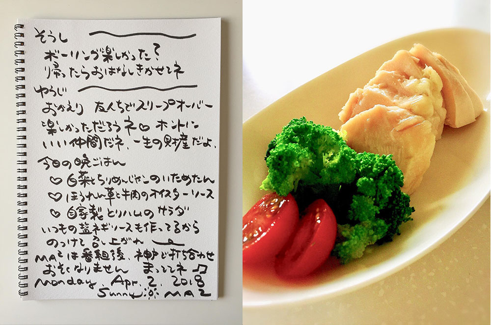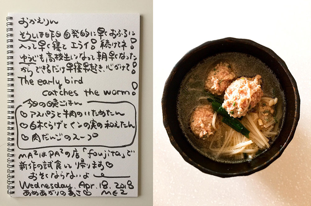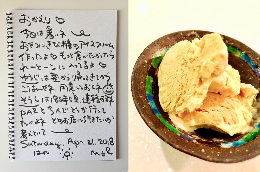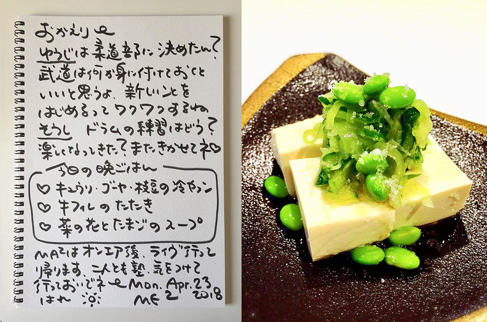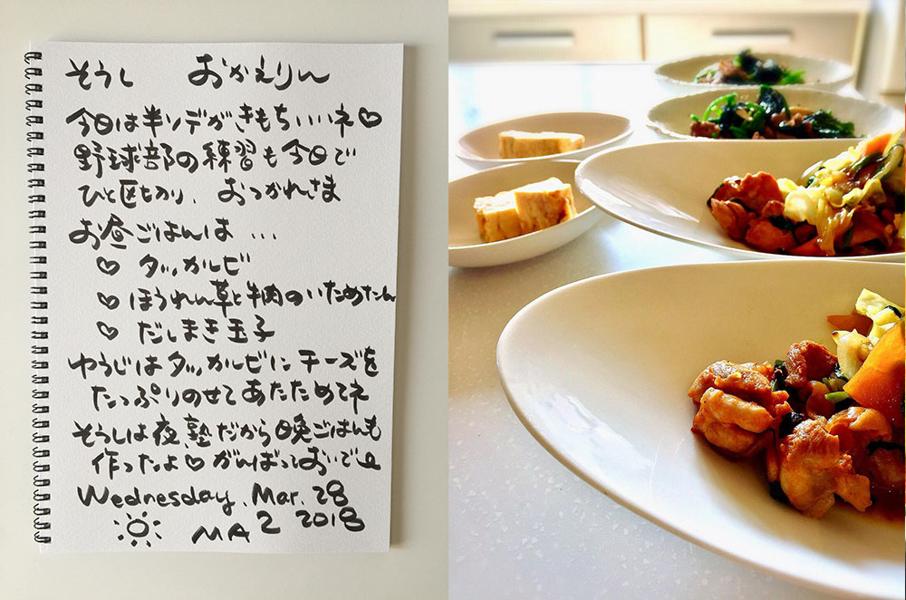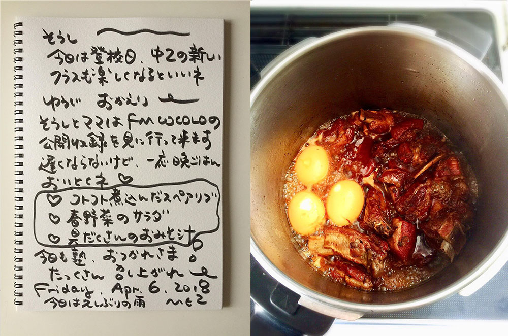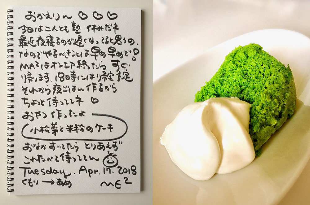 各ジャンルで、独特の視点とセンスで活躍する方々。そんな彼らに、あるテーマで1ヶ月間毎日記録をつけていただきます。日々の習慣や気づきから見えてくる、未来の暮らしのヒント。5月にご登場いただくのは、ラジオパーソナリティのMEMEさん。忙しい日々の中、毎日の献立を筆ペンで書いた置き手紙でお子さんたちとコミュニケーションを取っているMEMEさんに、その日の手紙とお料理を記録、紹介していただきました。