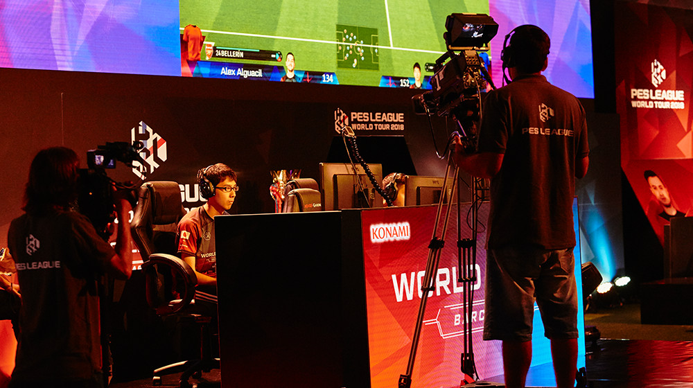「弊社における代表的なeスポーツの取り組みとしては、サッカーゲーム『ウイニングイレブン』シリーズの欧州大会を皮切りにグローバル展開を始めた2001年まで遡ります。海外では『PRO EVOLUTION SOCCER』という別タイトルで発売されているので、その略称にちなんで『PES LEAGUE』と題した、No.1プレイヤーを決めるKONAMI公式のeスポーツ世界選手権です。2018年の大会では、まずはネット対戦という形式で世界各国にてオンライン予選が開催され、成績上位プレイヤーがオフライン大会(アジアラウンド・南北アメリカラウンド・ヨーロッパラウンド)へ駒を進め、各大会の上位選手が決勝大会に出場しました。オフライン大会はドイツ、アルゼンチン、バルセロナなどで開催されリアルタイムで世界に動画配信されるので、視聴者はリアルなメジャースポーツに匹敵する盛り上がりをみせています」と、プロモーション企画本部、副本部長の車田貴之さんは話します。