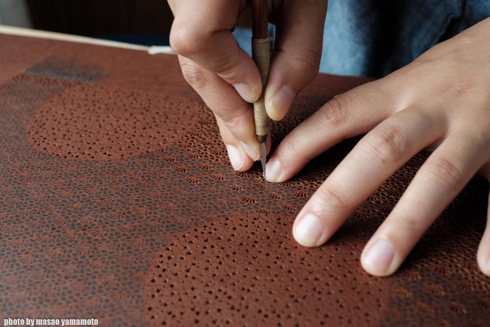 伊勢型紙とは、伝統的な染色道具です。和紙を柿渋で3枚ほど貼り合わせて丈夫にした型地紙と呼ばれるものに、様々な技法で彫刻を施し、それを使って着物や浴衣、さらには紙や革などを染めます。かつては焼き物の器の模様をつけるのにも使われました。私はその中の、彫る作業に従事しています。
