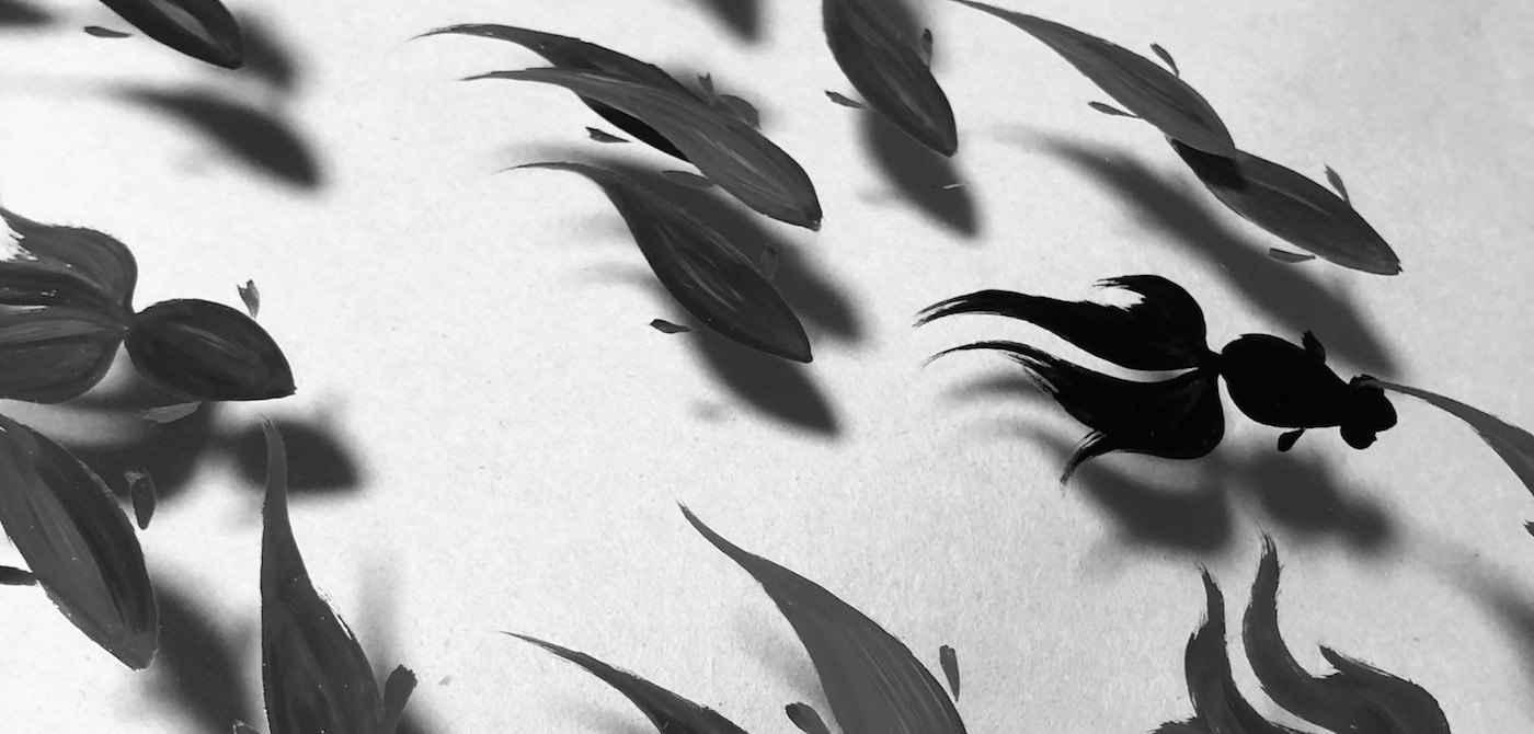アクリルに漆で金魚を描く。裏にできる影が趣深い。