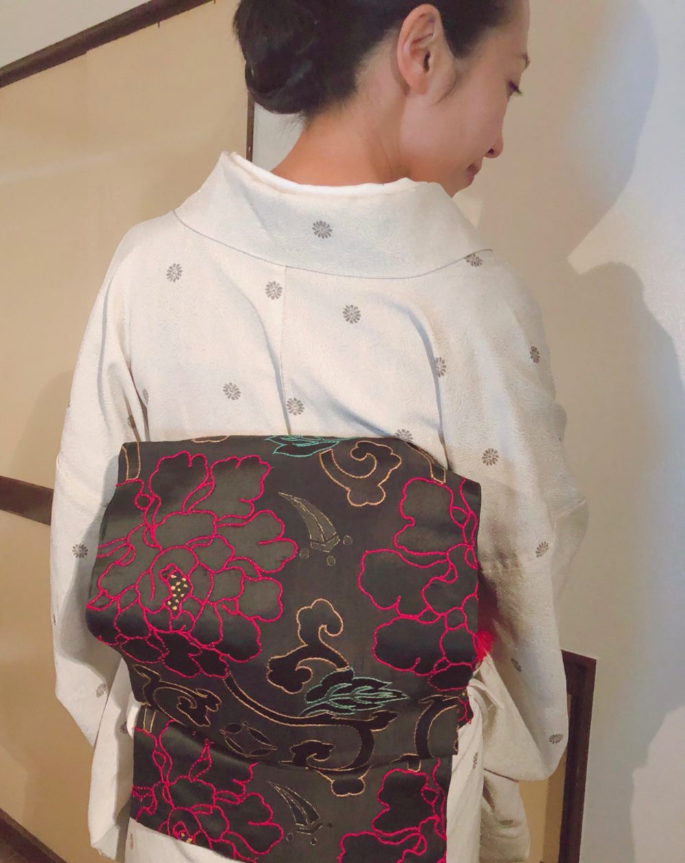 半年前から書道を習い始めて、その先生が初めてお店にご来店下さることになり、前から何と書いているのかなーと疑問だったヴィンテージの着物を選びました。