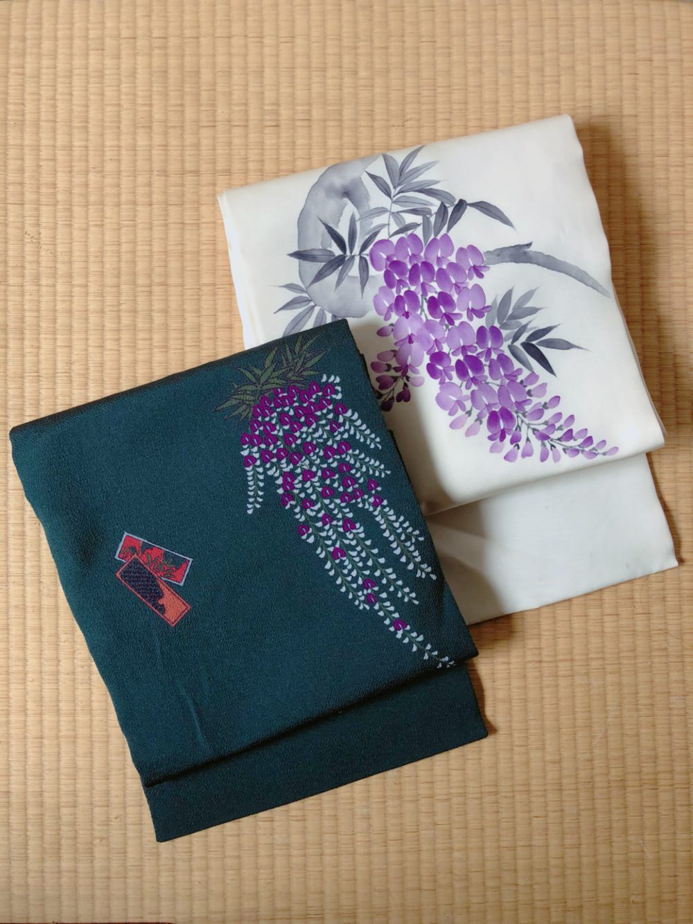 平日は、毎日着物を着ることにどうしても追われてしまうので、週末にゆっくり整理したり片付けたりしています。壁一面天井まで作り付けの棚にしていて、そこにびっちり帯を収納しています。季節が終わった帯はどんどん上の方へ、藤の帯もしまいました。来年の出番の頃はどんなかなーと思いながら、順繰り出したりしまったりも、また楽しいのです。
