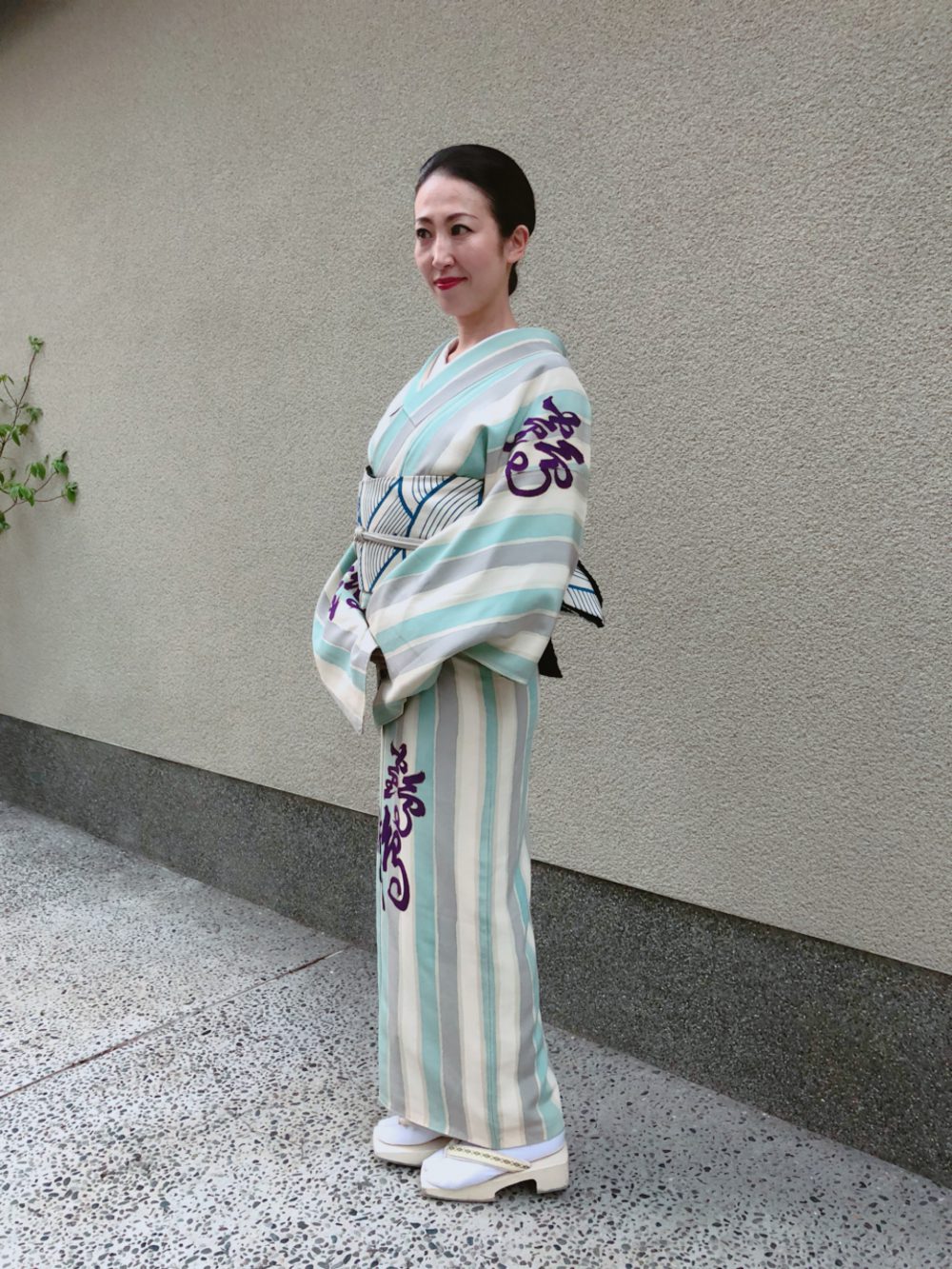 午前中激しい雷雨で、今日もポリの着物かなーと頭の中でコーディネートを考えていたら、わぁ!晴れた!そんな気分で着物の色を選びました。無地なので、長襦袢はちょっと派手目に紫と黒の縞にしました。昨日と同じ青海波の帯を。同じ帯でも着物が変わるとまた雰囲気が変わります。