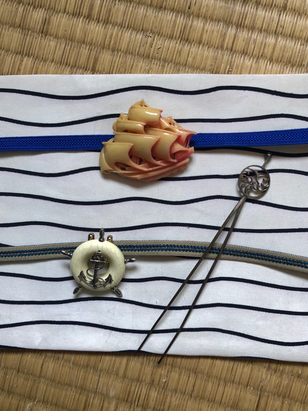 船関連のアイテム、こんなものも持っています。錨はアンティークのブローチで、帯留金具を付けました。シルバーのかんざしは、波にカモメ。以前、可愛いカモメのかんざしを京都に挿していったら、カモメがどこかに飛んでいってしまい、とてもショックを受けました。接続部分が動く凝ったデザインの古いかんざしだったので、今でも悔やんでいます。帯留もかんざしも、気に入ったものほどよくなくしてしまいます。