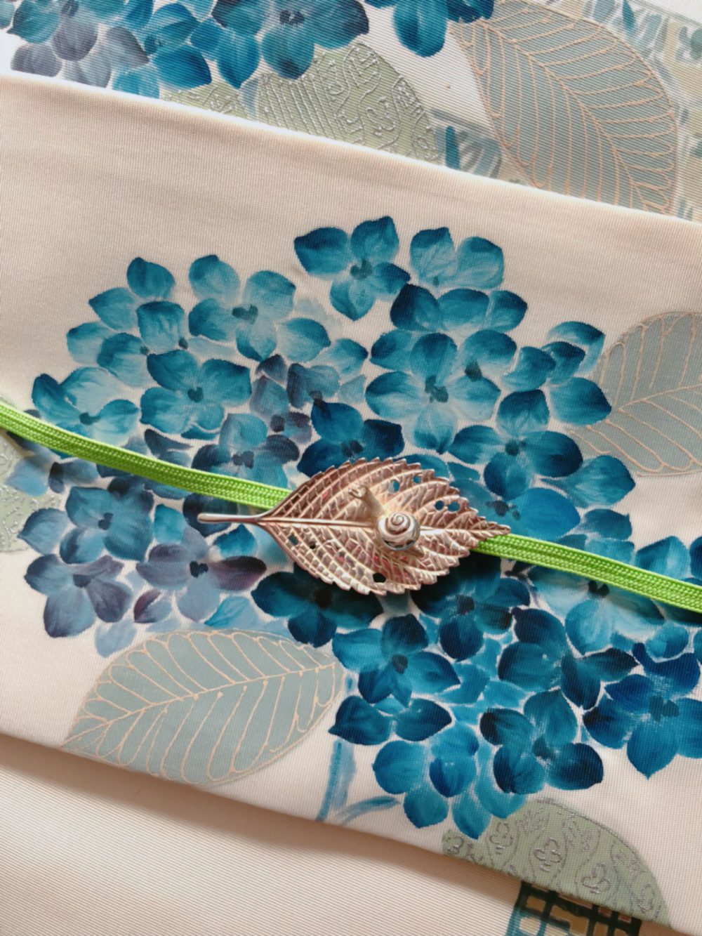 16日の写真では見ずらくなっていたと思うので、紫陽花とカタツムリのコーディネートをアップで。シルバーでできた帯留めは、葉っぱの小さな穴やカタツムリの目まで、細かく表現されています。立体感があるので、テーブルなどにぶつけたりしないように、身につけている時は緊張感があります。わずかな期間のお楽しみです。