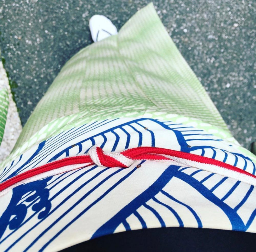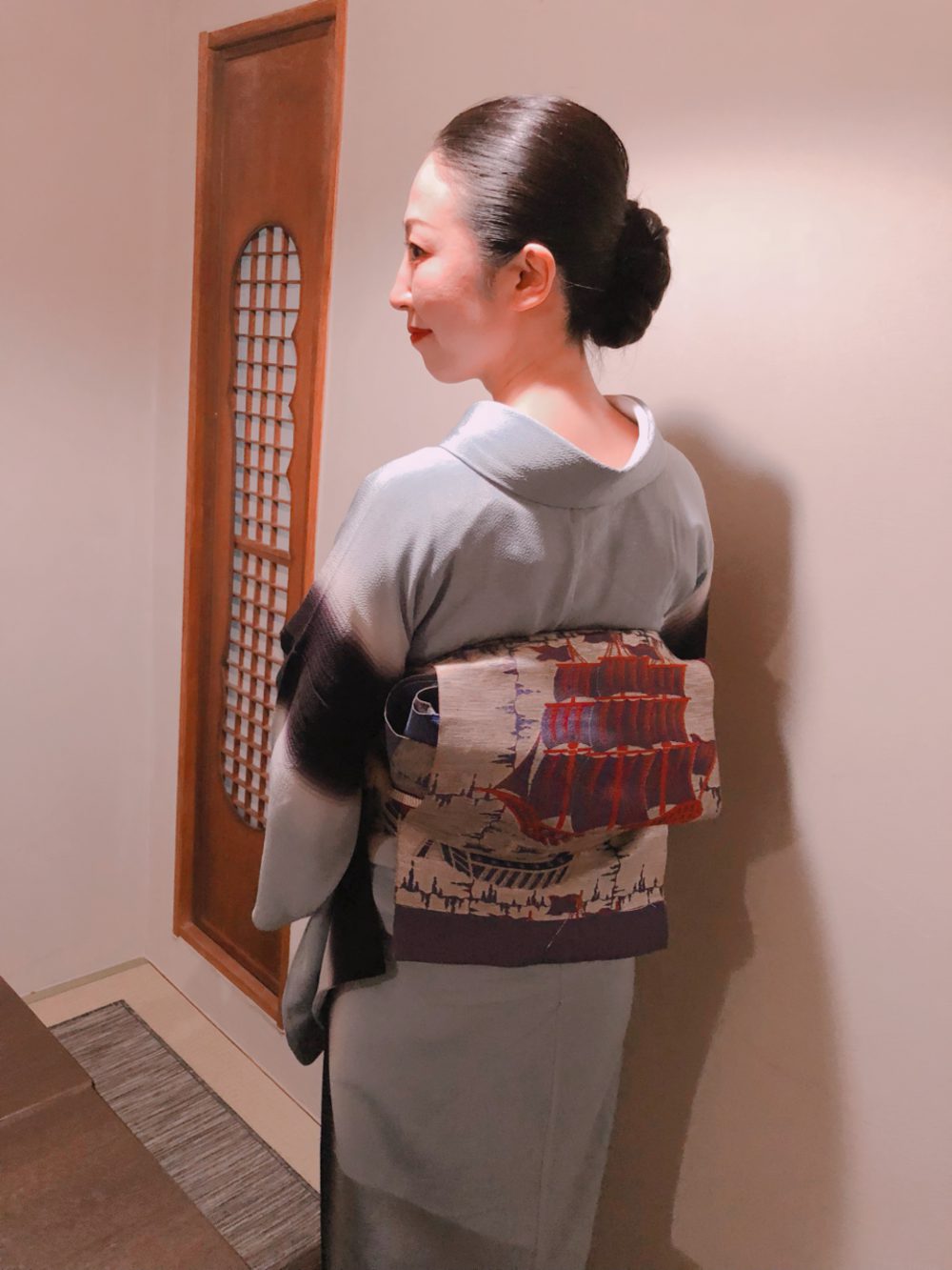 湿度が高く蒸し蒸ししていたので、風を感じるコーディネートをと思い、着物のブルーを海に見立て、帆船を浮かべてみました。好評でした!