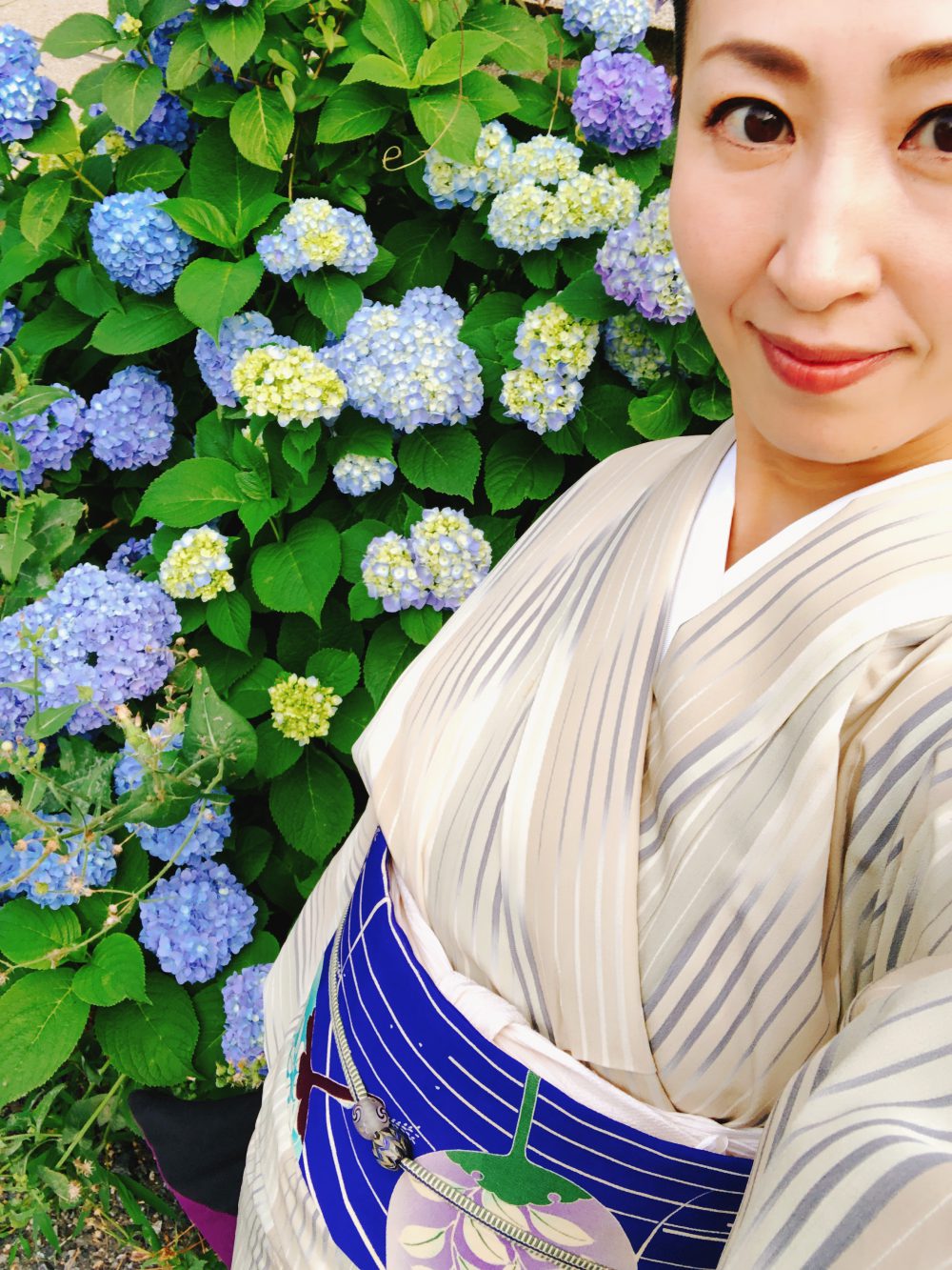道で紫陽花があまりに綺麗だったので、思わず自撮り。今日の帯は、元はアンティークの錦紗縮緬の長襦袢で、染めも団扇模様もあまりに美しく、長襦袢で下着として着るだけではあまりに勿体なく、帯に仕立て変えてもらいました。古いため生地が弱いので2部式帯にしました。大事に大事に締めています。