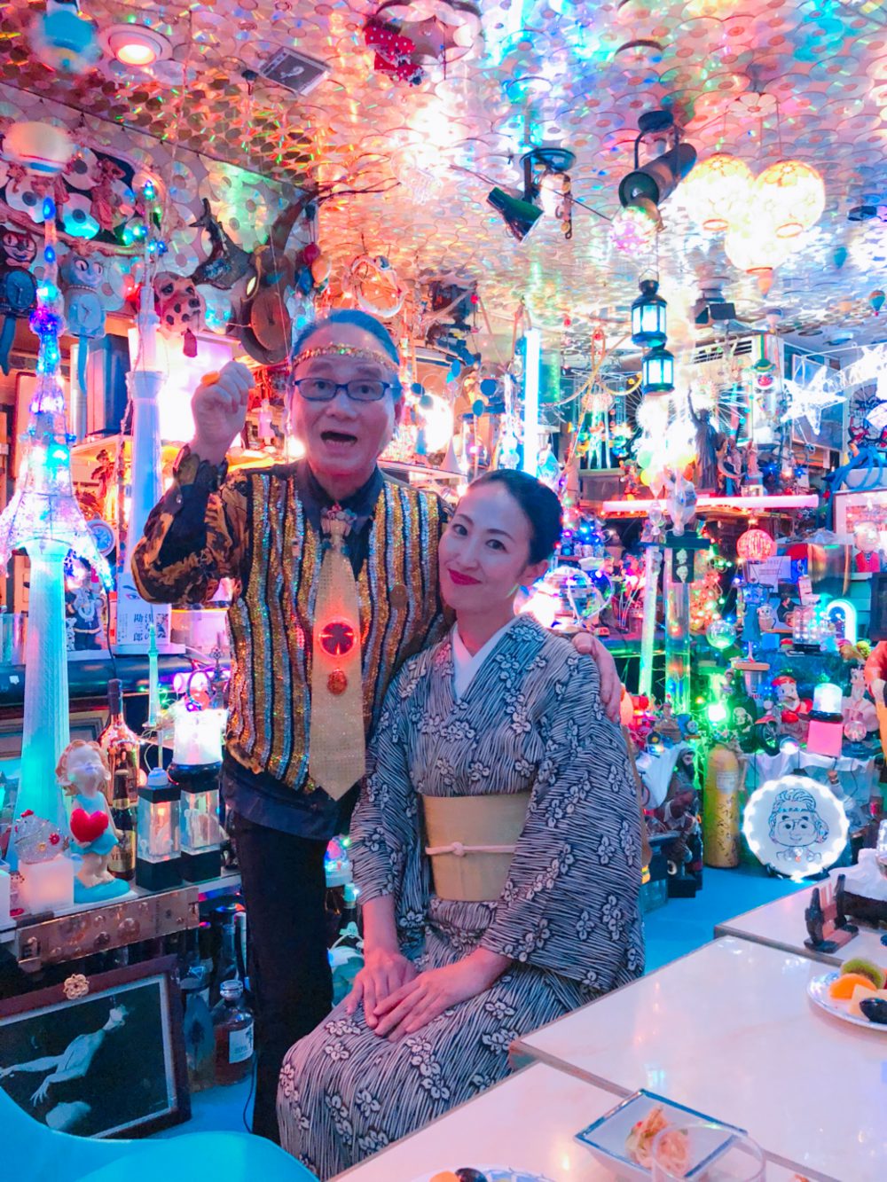 仕事終わりに友人達と鶯谷の知る人ぞ知るお店「よーかんちゃん」で合流。一緒に写っているのがよーかんちゃんです。電飾が以前より少なくなった気がして尋ねるとやはり半分くらい処分したそうです。これでも!(笑)着物は20年ほど前に目黒の故池田重子さんのお店で、母が選んでくれたものです。その時はあまりピンときてなかったのですが、数年前からはお気に入りになりました。好みも変わりますね。この空間には馴染んでいますか⁈