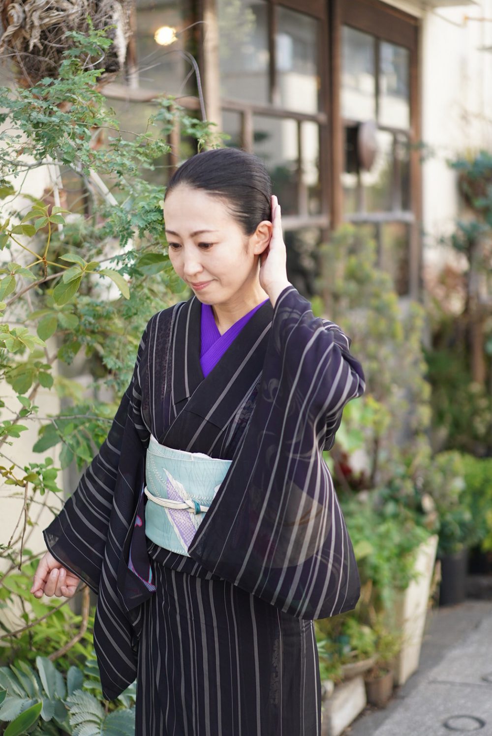 私は神楽坂に住んでいて、近所を歩いていてふと、着物が映える素敵な場所がたくさんある!と今更ながら気づきました。もっと早くからあちこちで写真を撮ればよかった…。ちょうどカメラマンの友人yOUが家に遊びに来る約束だったので、赤城神社裏の素敵な花屋さんの前で撮ってもらいました。