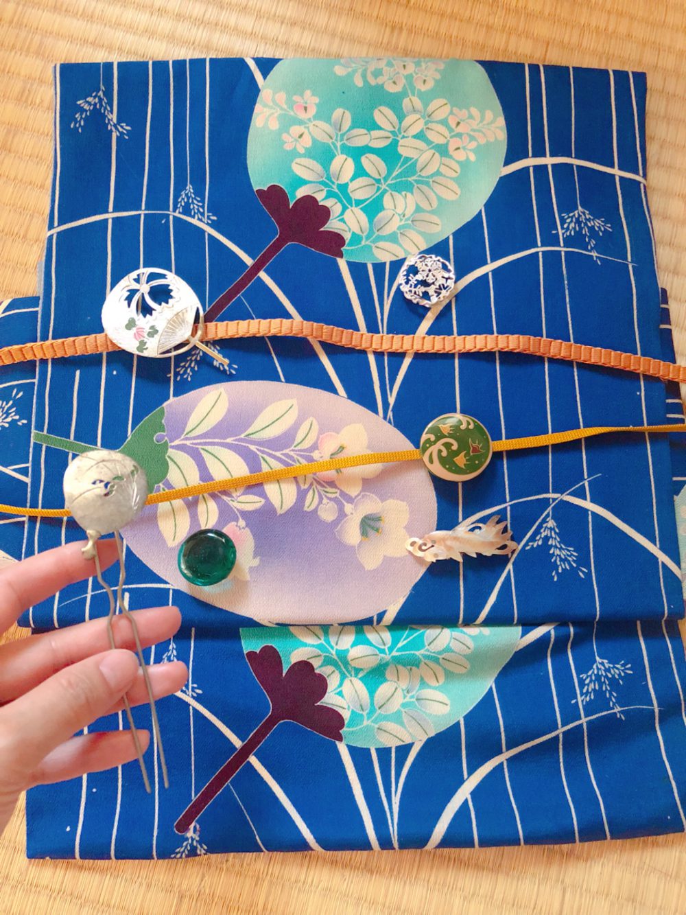 骨董市を巡ったりして、長い時間をかけて探し集めたお気に入りの夏小物です。左上の団扇の帯留は、おそらくかんざしのパーツで、壊れていたものを買って自分で金具をつけました。時計回りにその隣が、シルバーの作家さんに特注した雪の結晶で、冬にもしますが、夏の暑い日にも目に涼しいようにと身につけます。その下が漆塗りの波に千鳥。貝殻でできた鯉。その左隣は昔のガラス玉に帯留金具をつけました。団扇のかんざしは、アンティークかんざしの特徴で、飾りの部分が動いて角度が変わるように細工されています。その部分が古いため脆いので、大事に大事に、めったに使いません(笑)。
