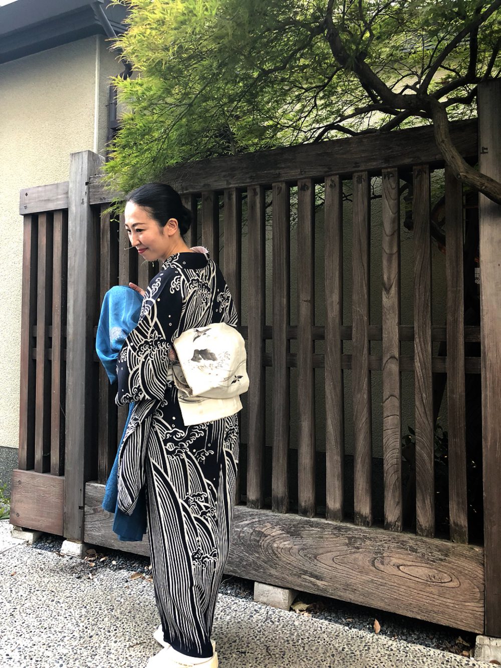 波の模様の帯を銀座結びで。