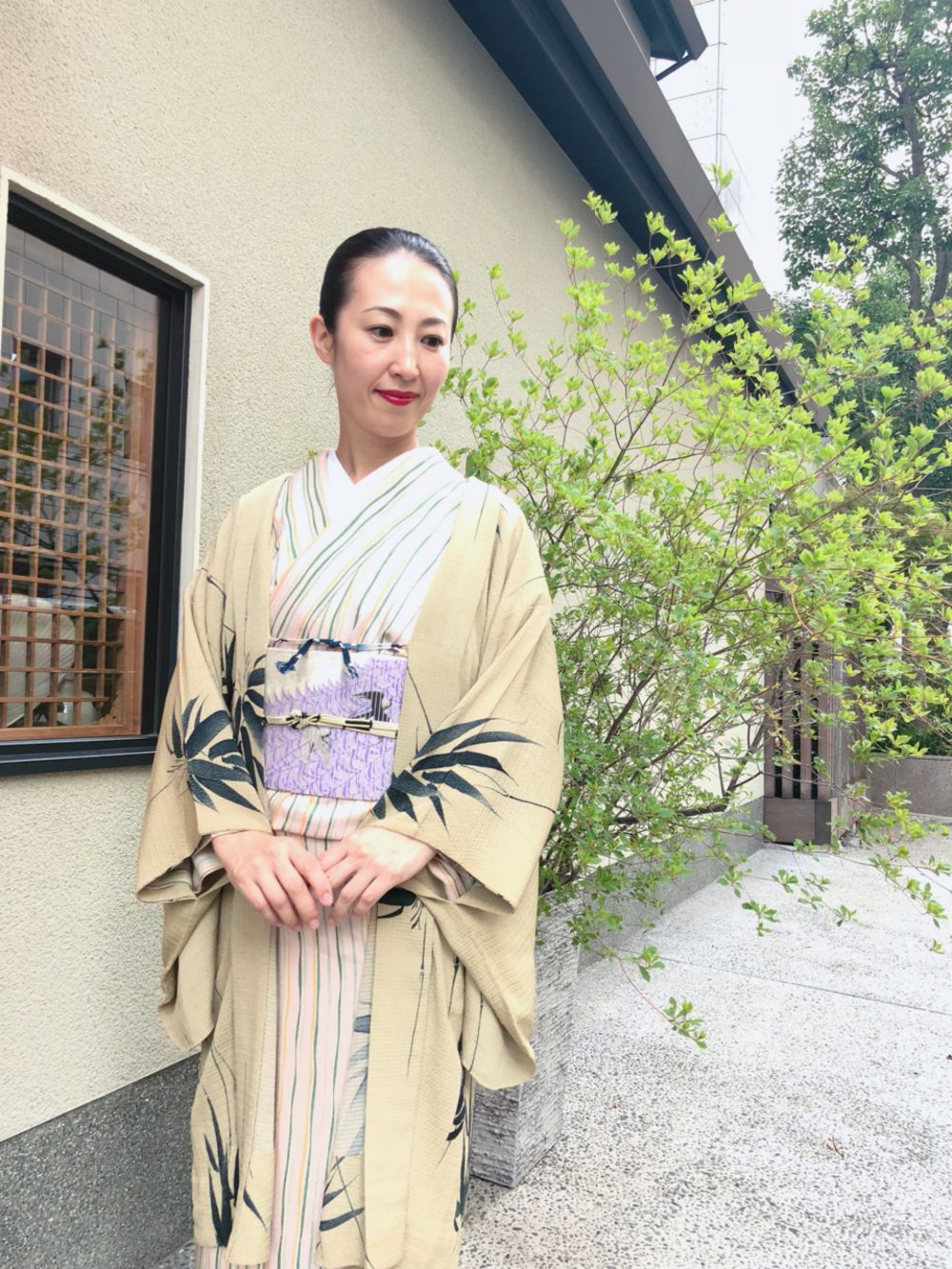 小雨降るしっとりしたお天気だったので、傘と柳の帯にしました。着物をほどいて仕立て変えた名古屋帯です。着物は竹の縞ですが、雨にも見立てました。暗いお天気の日は、気持ちをぱっと上げたいので、いつも明るい色の着物を選びます。