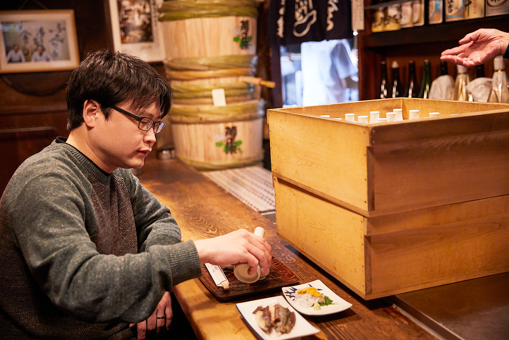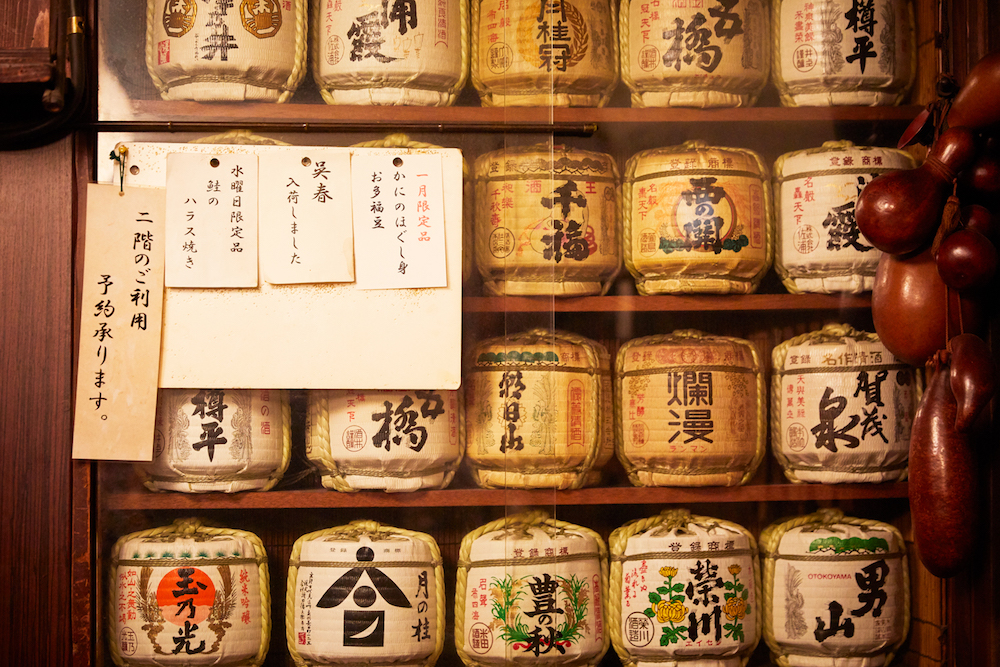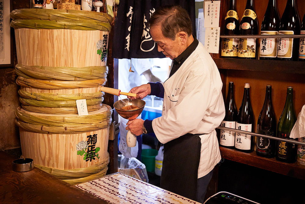 「お酒は何にしましょう?」と、大将が尋ねる。お店には日本酒が40種類以上。そのうちでも一番人気だというのが、カウンターの奥に鎮座している菊正宗の樽酒だ。お客の「いいねえ、まずはそれを一本!」という声が響き、心地よいざわめきが酒場に満ちていく。樽酒は5日前後で空になるという。