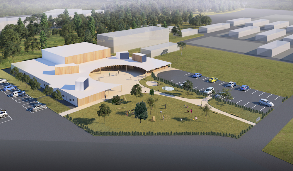 北海道大樹町にて、2019年度オープン予定の学童保育所・児童館(仮称)。特徴的な庇(ひさし)を作り、夏は涼しくし、冬は日差しを取り込む。雨・雪を避けながら来所することができる建物。