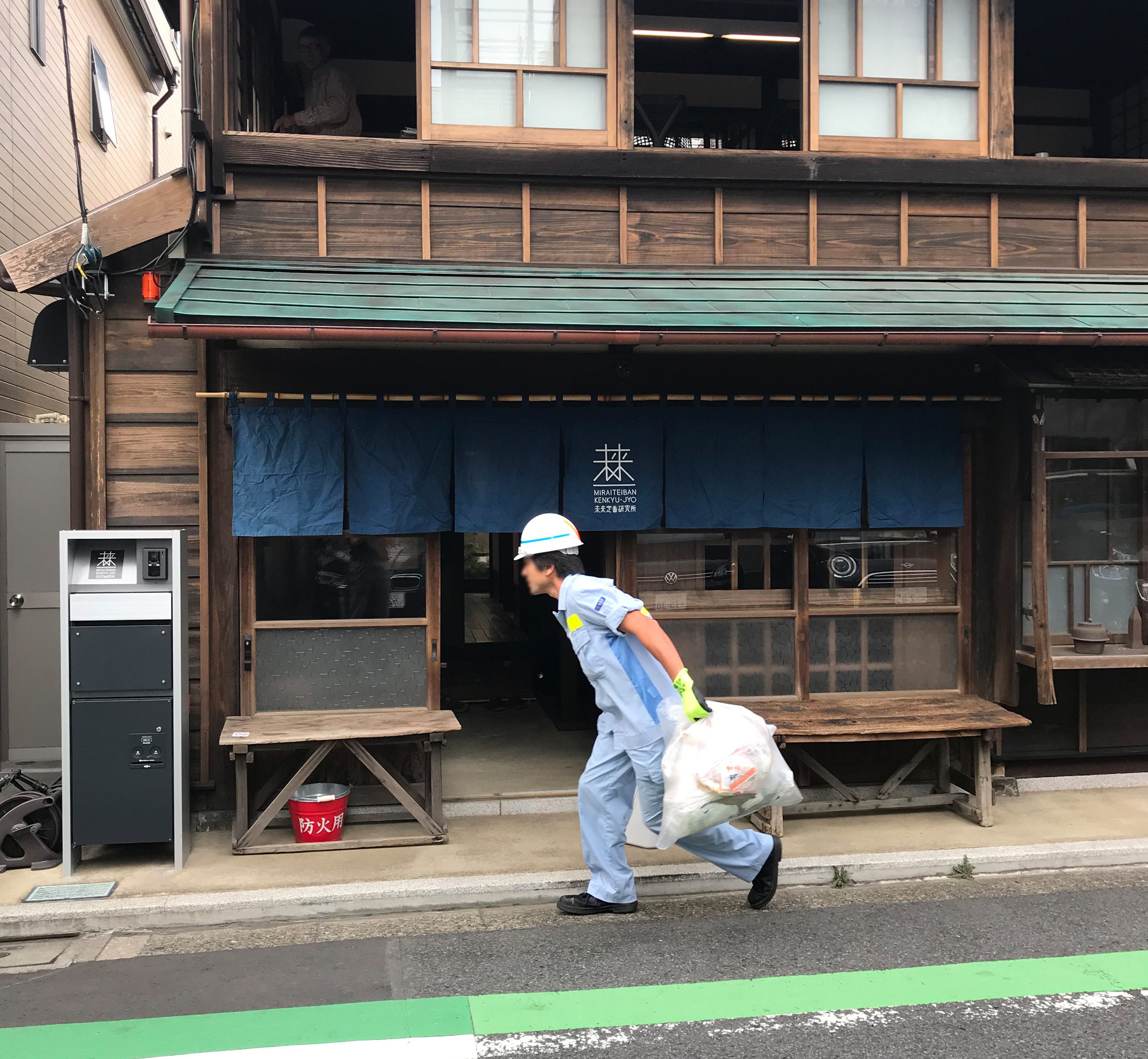 毎朝、出社したらすぐ、箒と塵取を持って外へ出る。