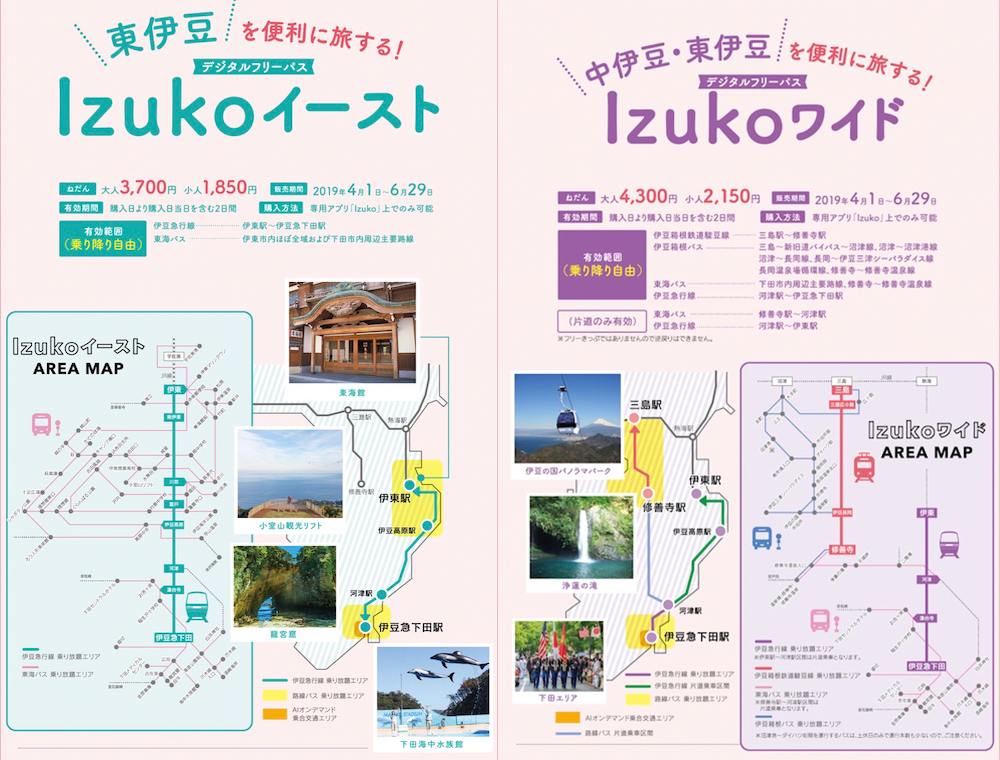実証実験はJR東日本が開催する「静岡デスティネーションキャンペーン」に合わせて開始されました。利用者にとって嬉しいのは、2日間有効のデジタルフリーパスが用意されていること。東伊豆で使える「Izukoイースト」(3700円)と中伊豆と東伊豆を包括する「Izukoワイド」(4300円)があり、鉄道やバスを乗り放題(一部の交通は一方向のみ乗り降り自由)で利用できます。また、「Izuko」のアプリを使えば、下田海中水族館や伊豆シャボテン公園など、観光施設の入場券を割引価格で事前購入できるのも魅力です。