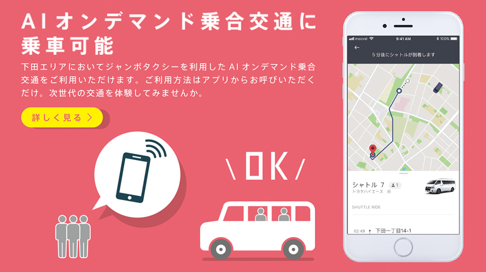 今回の実証実験では、AIを活用したオンデマンド乗り合い交通も導入されました。伊豆急下田駅周辺の対象エリアでは、7人乗りのジャンボタクシーが稼働していて、「Izuko」のアプリで乗車場所と降車場所を選ぶと、AIが近くにいる車両をリアルタイムでマッチングし、最適な走行ルートを決定してくれます。現在は観光スポットを中心に停留所を設置していますが、今後は病院や銀行、スーパーなどにも停留所を用意して、地元住民の足としても機能する仕組みを検討しているそうです。地元の方々の反応はどのようなものだったのでしょうか。