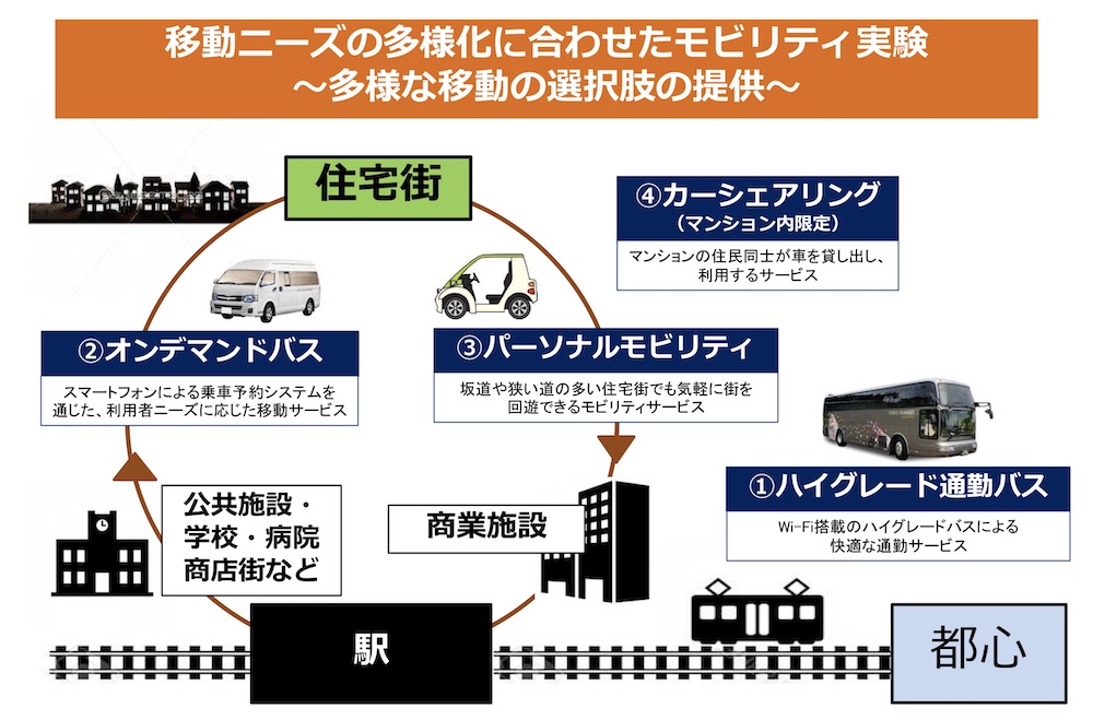 1月下旬から3月下旬にかけて実証実験された『郊外型MaaS』では、ハイグレードバス、オンデマンドバス、パーソナルモビリティという3つのモビリティサービスが提供されました。それぞれどのようなサービスなのでしょうか。