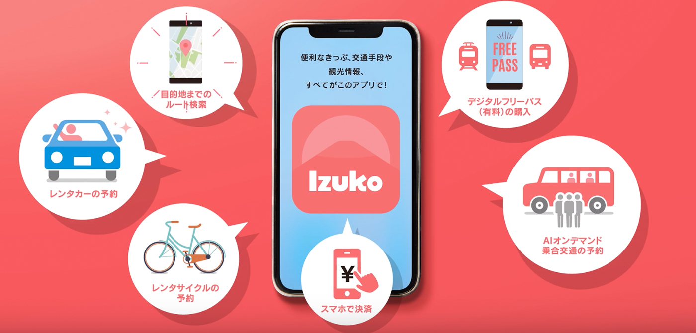 4月から伊豆エリアで始まったのが「観光型MaaS」の実証実験。東急電鉄とJR東日本が中心となり、伊豆急行、伊豆箱根鉄道、伊豆箱根バス、東海自動車など地域の主要な交通事業者が参加。ドイツ、ダイムラーの子会社ムーベルと開発したアプリ「Izuko」を使うことで、既存の鉄道とバスに加えて、オンデマンド交通、レンタカー、レンタサイクル、さらには観光施設や宿泊施設の検索、予約、決済できるサービスを目指しています。