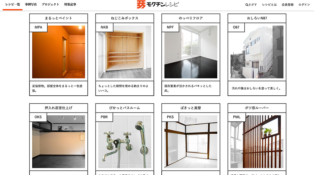 その後モクチン企画は法人化。2019年4月の時点では、47案のレシピが公開されています。「すこしの予算とちょっとした工夫で、たくさんの魅力を」というコピーとともに、壁塗装、建具交換、ベンチ収納、照明などのアイデアが並んでいます。
