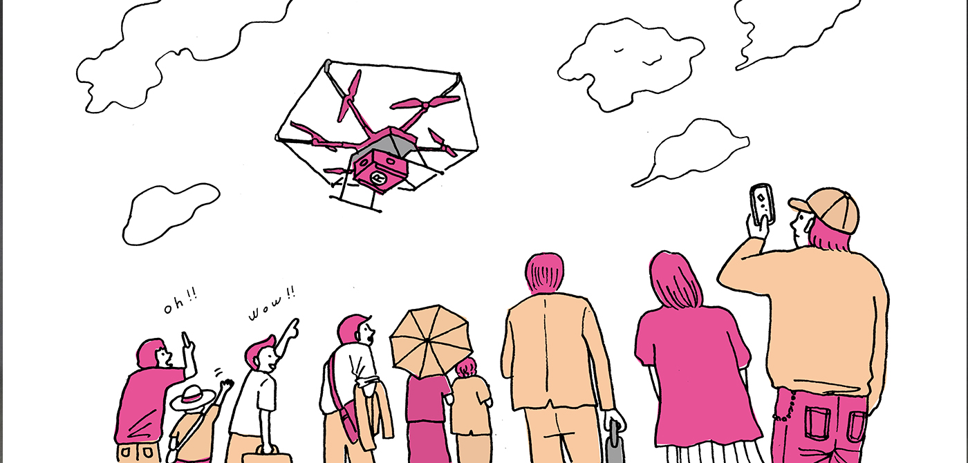 いわゆるピザ店の宅配のようなオンデマンド配達を、ドローンで補完していくことを最初におこない、その後、本格的な物流改革になっていくであろうと考えています。本格的な物流改革となるときには、都市部であれ、複数台のドローンが行き交いながら飛んでいるイメージです。