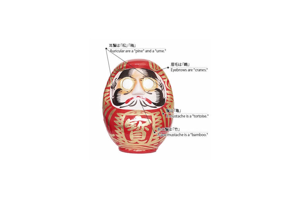 特徴的なのは、幸運の象徴とされている「鶴亀松竹梅」が顔の中に描写されていることです。そのデザインは、谷文晁という有名な絵師が行ったと言われているんですよ。