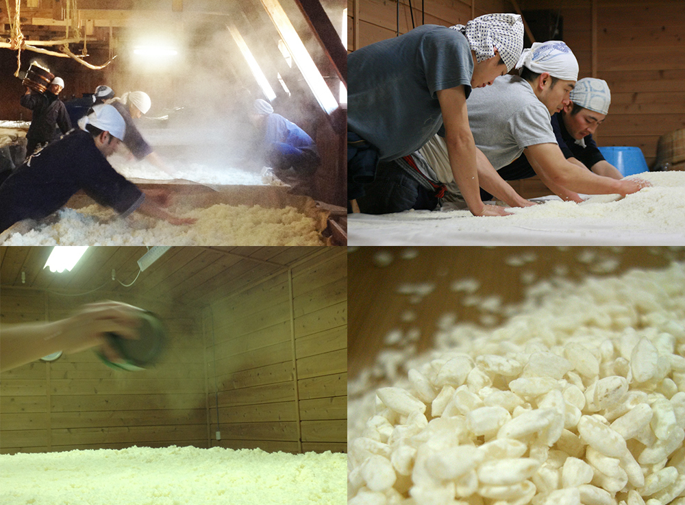 (左上)甑から掘り出した熱い蒸米を広げて冷まし、微生物達に快適な温度にしている。(左下)蒸米に黄麹菌を散布する様子。(右上)蒸米に黄麹菌を植えつけた後、麹室(こうじむろ)ではこまめに切り返し作業を行い、麹菌に居心地のいい場を作って生育を助けている。(右下)できあがった麹。食べると栗のようなほのかな甘みがあるのだそう。