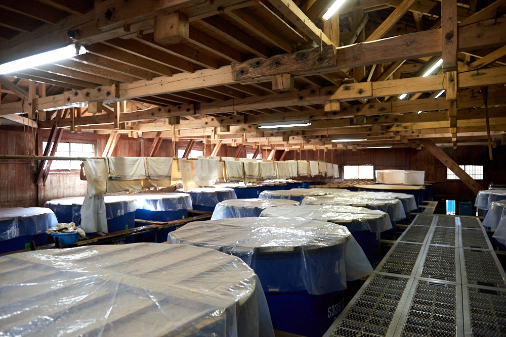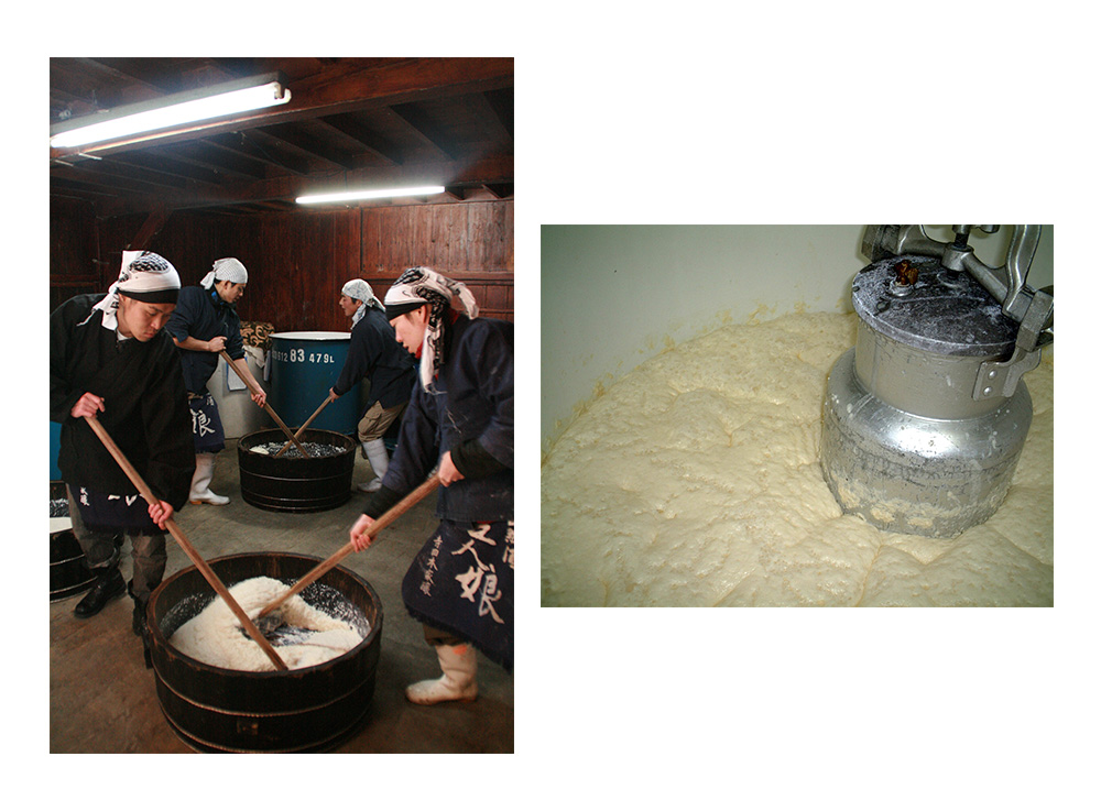 桶に仕込み水と蒸米、麹を入れて「かぶら櫂」という櫂棒で、繰り返しすりつぶします。冬の季節、極寒の蔵の中で1日に3、4回行われるこの作業は、蔵人たちが「酛摺り唄」の唄声を響かせながら、ゆっくりと麹の力を引き出します。これをタンクに入れて、毎日暖気を送り込み発酵場を整えると、2、3日後には「硝酸還元菌」と乳酸菌が自然に増殖。タンク内に乳酸が増加し、酸性に傾くと「硝酸還元菌」と「乳酸菌」が減少し始め、そこからやっと酵母が活動を開始します。ここまで約30〜50日間ほどの時間をかけて、やっと「酛(酒母)」が完成します。途中で人工乳酸を添加し発酵を促進させる速醸という方法もありますが、寺田本家では自然の力だけで手間ひまをかけて力強い酒母を造り上げています。