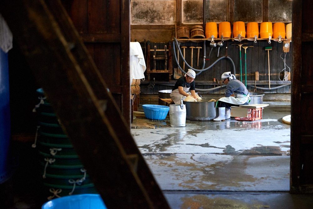 〈寺田本家〉の酒の原料となるものは、〈寺田本家〉の蔵から培養した「黄麹菌」と、井戸から汲み上げた地下水を浄水した「仕込み水」と、契約農家や〈寺田本家〉の田んぼで育てられた無農薬米を蒸した「蒸米(むしまい)」です。米は蔵人が素手で洗米し、仕込み水で浸水したのち、甑(こしき)と呼ばれる巨大な蒸し器で熱を加え蒸米にします。それを手のひらで麻布の上に広げ、適温に冷ましたところに、黄麹菌を一粒ずつ植え付けて麹室で繁殖させます。