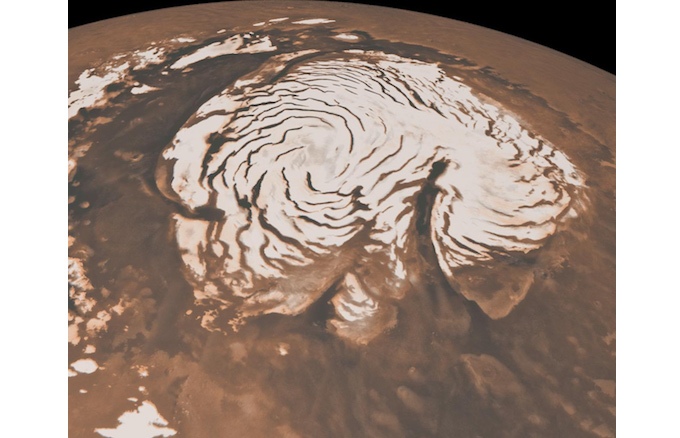 火星にも、極地には氷があります。そこは砂と氷のサンドイッチ状の地層になっており、独特の景色が広がっています。望遠鏡から火星を見ると、白い帽子を被っているように見えることから「極冠」という名に。