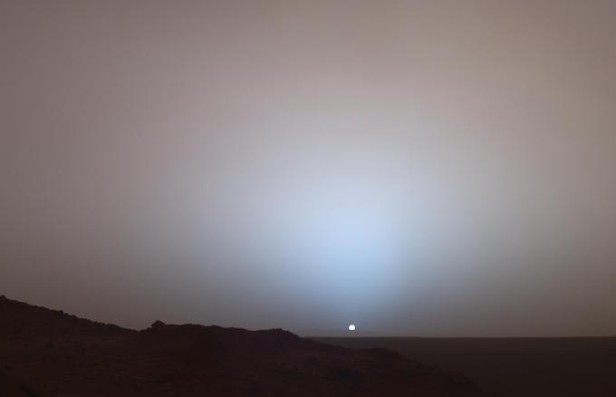 火星では埃が常に舞っているので、日中の空は赤茶っぽい色をしていますが、太陽が沈む頃には空は青くなると言われています。地球の夕焼けとは違う、幻想的な光景が広がります。