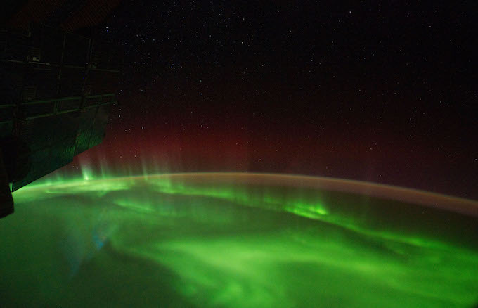 あと、オーロラも絶景でした。地上では1か所から上空を見上げるので、カーテンのようだと表現されますが、上空から見ると、地磁気の北極、南極を中心にすごく広い円弧を描くので、途切れつつもドーナツのように輪っかになっているんです。カーテンではなく、広い絨毯のようでした。