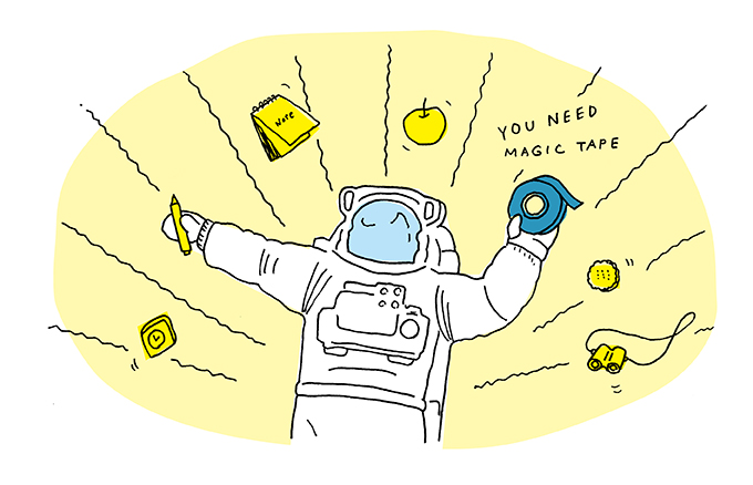 ものをポケットに入れておくと全部浮いてしまうからです。ペンなどは洋服にピタッとつけていました。地上で事前に用意していましたが、「これにもつけたいな」と思った時のために、ステッカー式のマジックテープをたくさん持って行ったので、すごく活用しました。