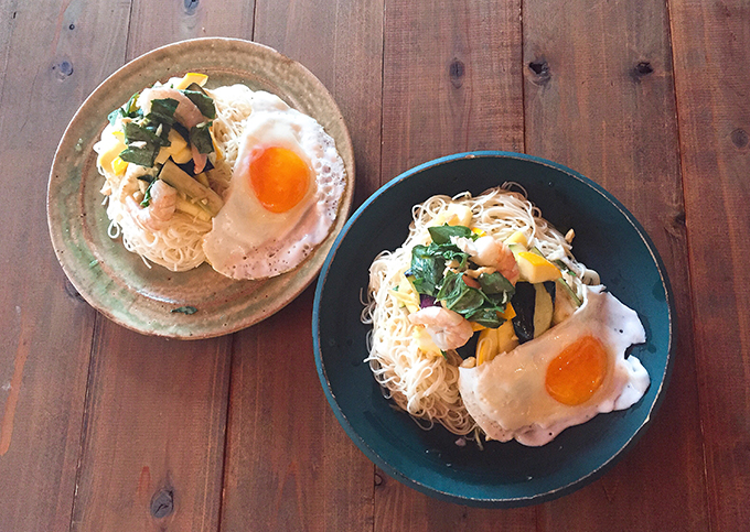 栗田ご夫婦が作るそうめんのアレンジ料理「ベトナム風ぶっかけそうめん」。具材は夏野菜とボイルしたエビ、それに目玉焼き。かけダレはアジアンバジルベースで作り、エスニックな味に仕上げたという一品。
