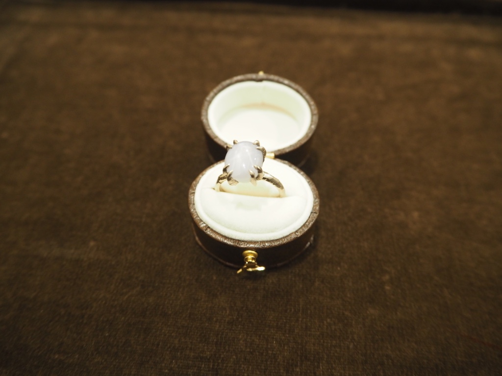 ムーンサファイアで作ったお気に入りのリング。石によって台座が変わる1点もののリングは、お店でも取り扱っていて、今や人気商品に。