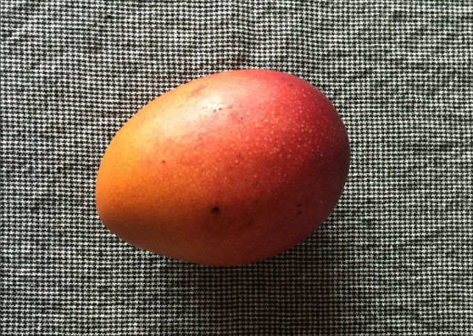 ある夏の日に頂いたマンゴー。たっぷりと陽を浴びて育った銀朱色のマンゴーと、テーブルクロスのコントラストが美しくて思わず撮影したという1枚。