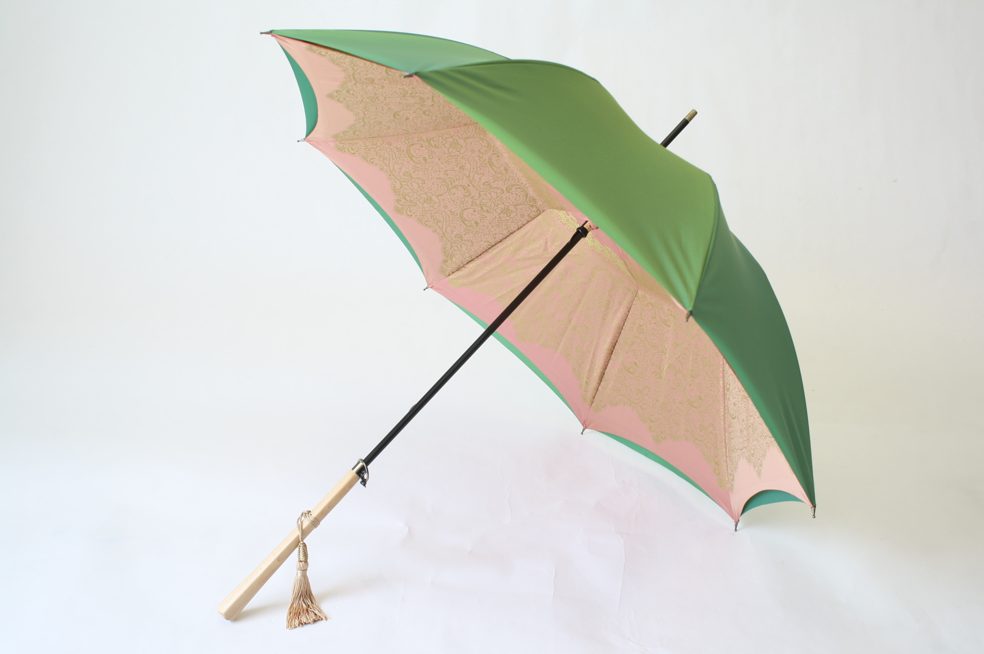 「1866(イチハチロクロク)-kawazu-」槙田商店/伝統の蛙張りの技法を用い、表は光沢の美しい先染めならではのシャンプレーの生地を使用。見る角度で繊細な色の違いを楽しめる雨傘。/サイズ:直径91cm×高さ93cm×親骨の長さ55cm/重量:約335g/素材:ポリエステル100%/色:レース×グリーン