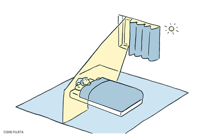 毎日気付いたら寝ているので、快眠を意識したことはないのですが、強いて言えば、寝る時に部屋を完全に暗くすることは避けています。朝、外の光を感じずにアラームの音だけで起きるのは、何となく体に悪い気がしませんか?自宅では遮光カーテンを使っていますが、少し開けて外の光が入るようにしています。〈未来食堂〉を始める前に、修行の一環で、半年ほど家の掃除や料理などを行う家事手伝いの仕事をやっていました。平日忙しく働いている単身の男性の家を担当すると、遮光カーテンで日中でも部屋中が真っ暗ということがよくありました。「朝がなかなか起きられないんだよ……」と相談されることもあったので、「カーテンを少し開けて寝たほうが良いですよ」とアドバイスしていました。寝る時の暗さは人それぞれ好みがあるかもしれませんが、夜から朝にかけて外が明るくなっていくことを感じながら少しずつ体を起こしていくのがいいと思います。